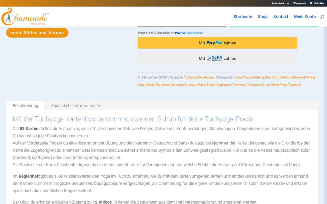 Yoga Verlag Chamundi - Screenshot der Produkt-Beschreibung auf der Produktseite der Tuchyoga Kartenbox, Desktop-Ansicht